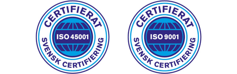 • Vårt arbetsmiljöarbete är certifierat enligt ISO 45001.